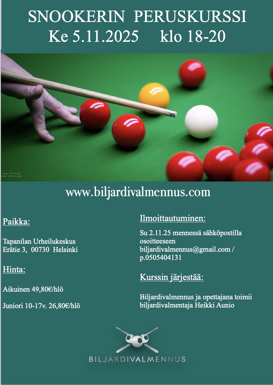 Ilmoittaudu pool biljardin tai snookerin peruskursseille alla olevan yhteydenotto painikkeen kautta.