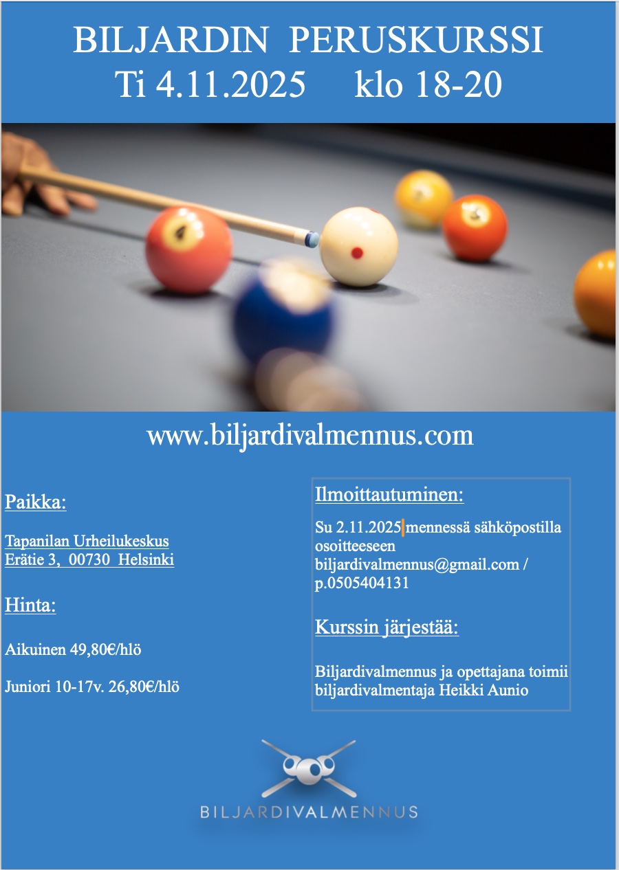 Avointen kurssien lisäksi on koko ajan tarjolla yksityisvalmennuksia. Ota rohkeasti yhteyttä ja astu biljardin kiehtovaan maailmaan!